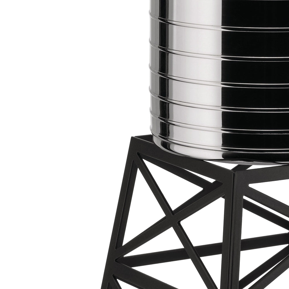 Created by Daniel Libeskind for Alessi, this refined container with a mirror-polished 18/10 stainless steel surface is paired with a matching stand, evoking the silhouette of a water tower with a touch of sophisticated playfulness.
