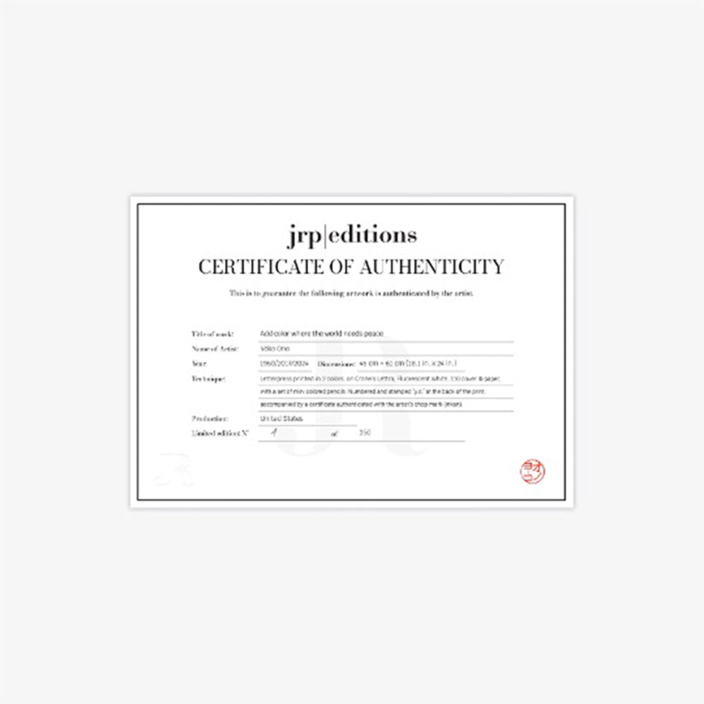 To celebrate the new printing of EVERYTHING IN THE UNIVERSE is UNFINISHED, Yoko Ono has partnered with JRP|Editions to create a limited-edition artwork: Add color where the world needs peace