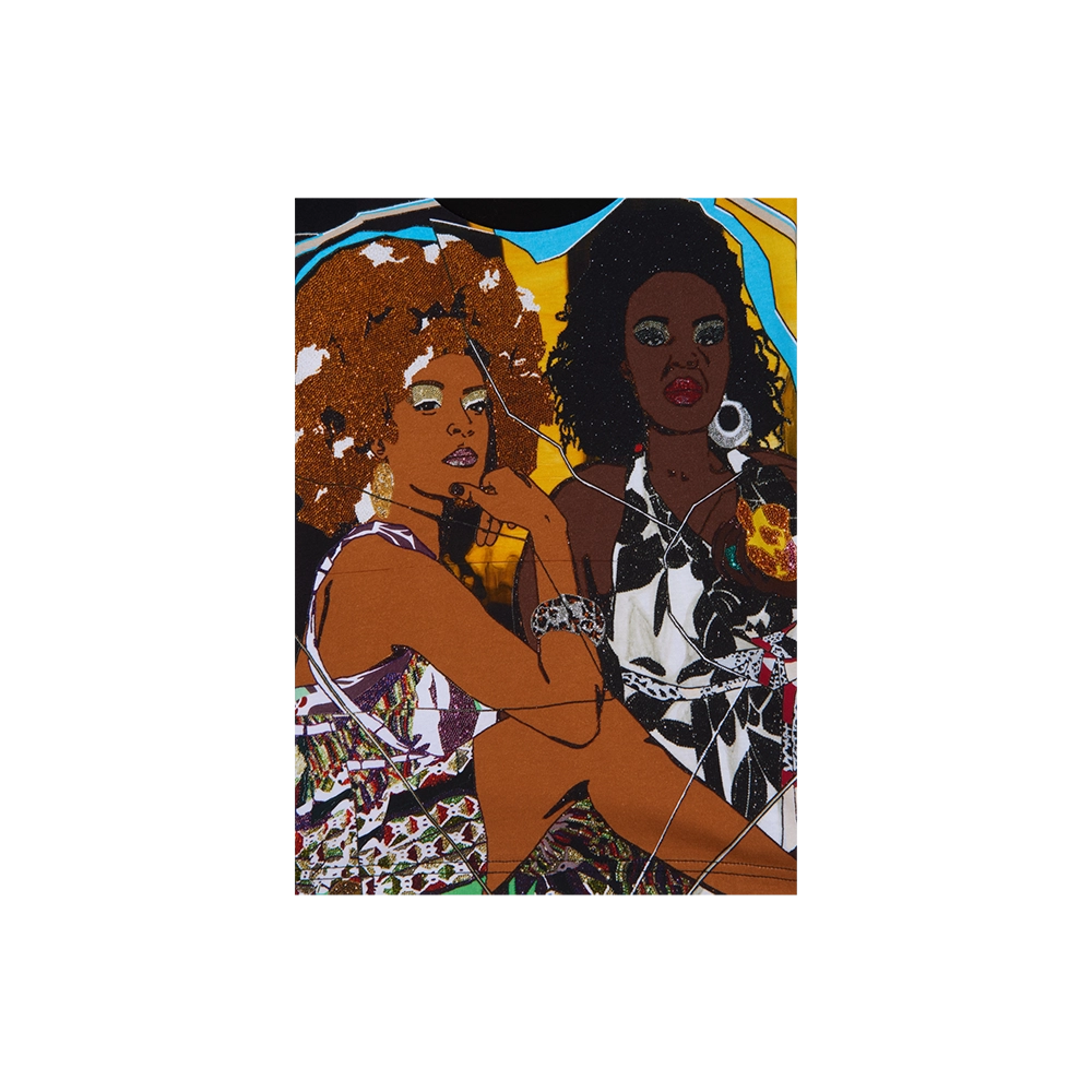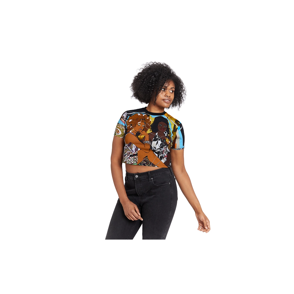 Mickalene Thomas's iconic artwork Le Déjeuner sur l'herbe: Les trois femmes noires is digitally printed on the front and back of our cropped  T-shirt.