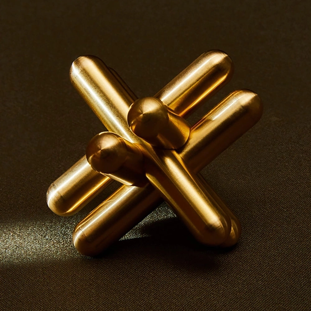 Six uniquely notched brass bars precisely interlock in a single configuration to form the classic "jack" shape. Expertly crafted with exact milling and weighing just over a pound, this piece serves as an elegant desk accessory, sturdy paperweight, and captivating diversion. However, a word of caution: once dismantled, reassembling it may prove quite challenging.