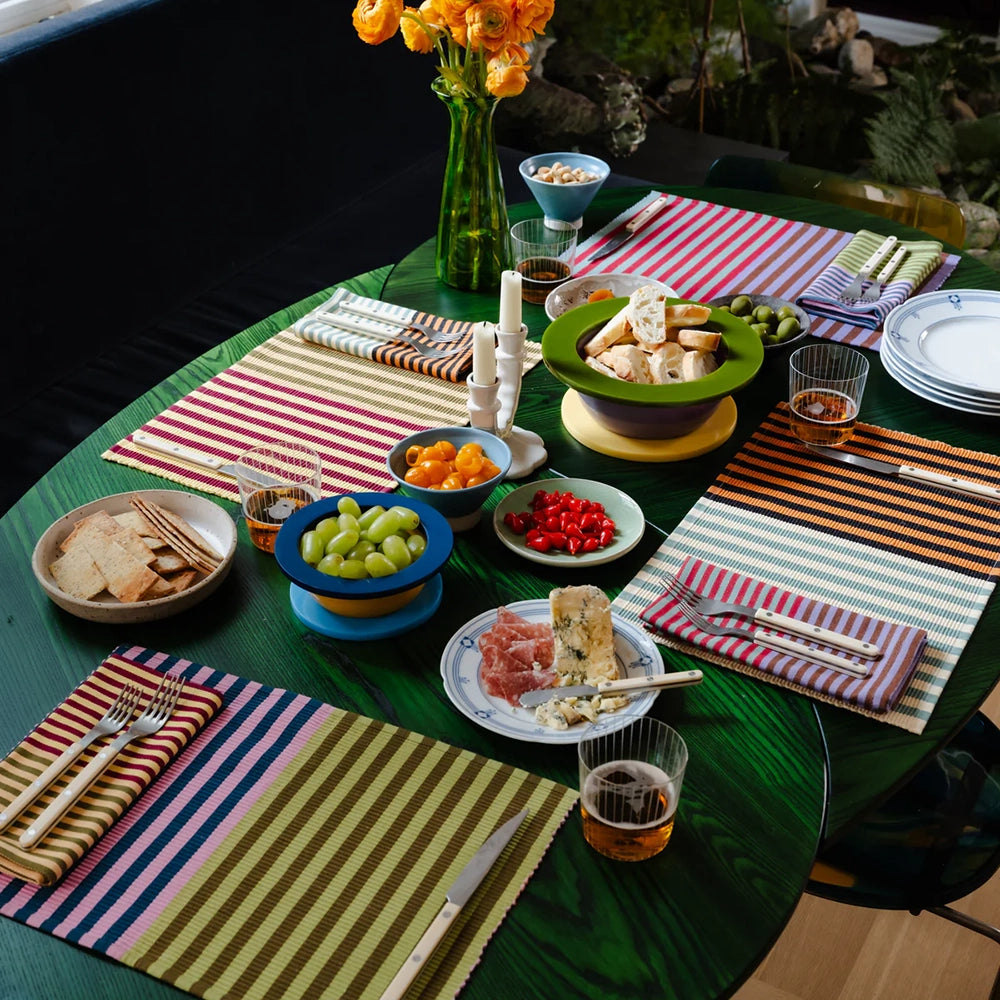 A curated collection of four cotton placemats, each showcasing a distinct tri-color striped pattern with subtle ribbed detailing. This mixed set delivers versatile table styling, pairing complementary colorways for dynamic place settings that work across various dining occasions and décor schemes.