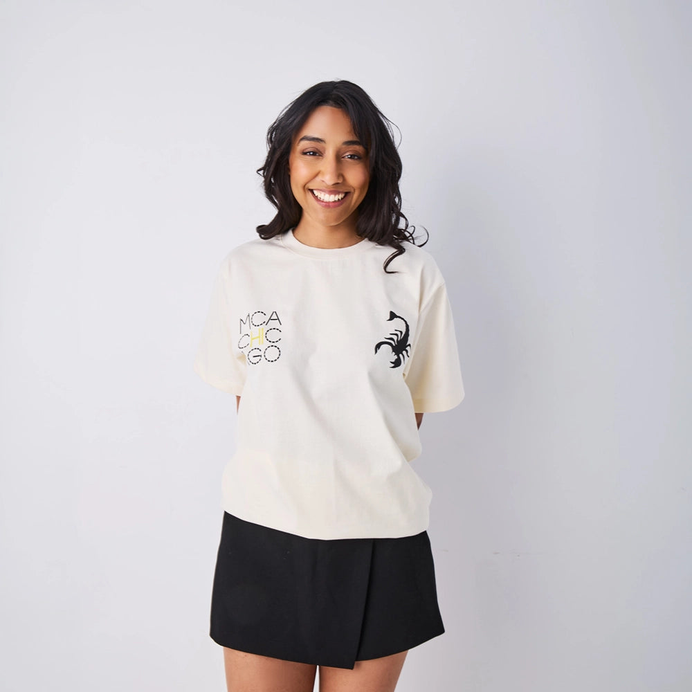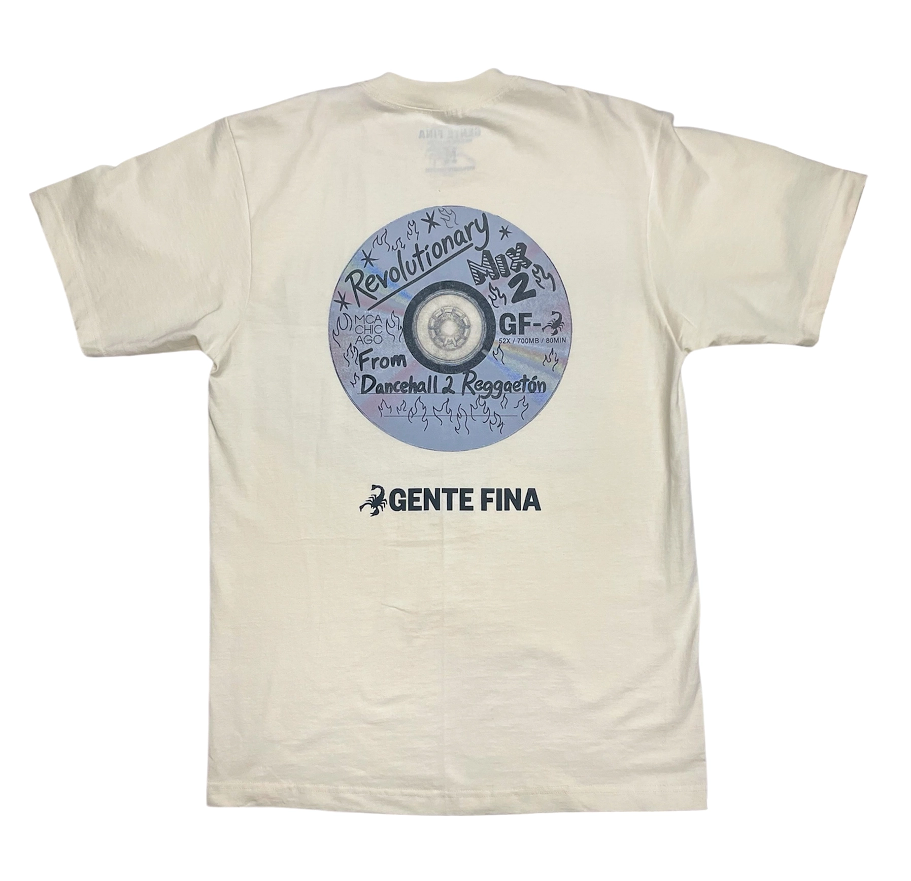 Celebrate the Dancing the Revolution: From Dancehall to Reggaetón exhibition with this MCA exclusive t-shirt, designed in collaboration with Gente Fina. The back features a striking CD graphic—a nostalgic tribute to the era of custom playlist burning. This piece merges music, memory, and movement into wearable art that honors the cultural currents shaping the contemporary world.