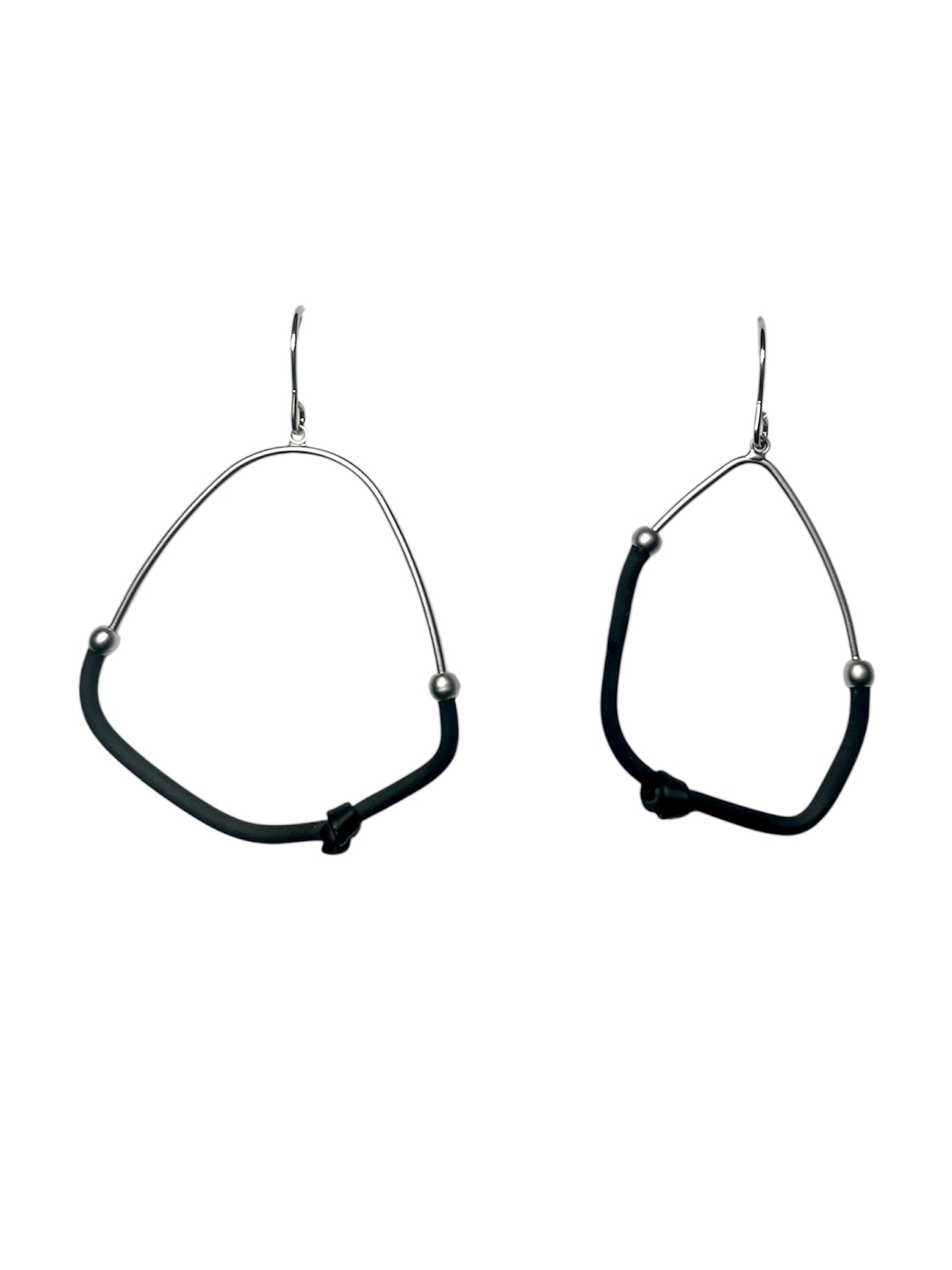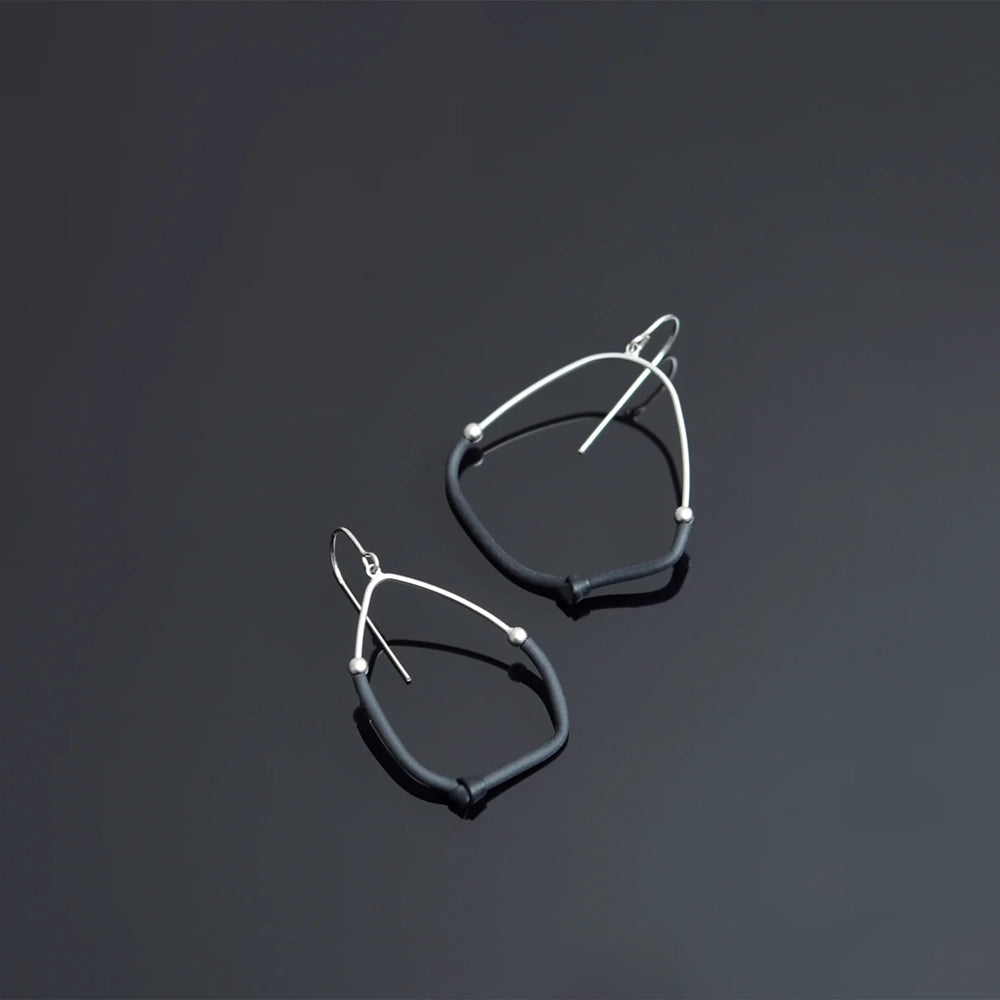 Fluid in form and raw in spirit, the Morph earrings explore the tension between structure and spontaneity. Hand-tied black cord twists through sculptural, organic silhouettes, merging with our signature matte gold and black, alongside silver-black accents. Each earring is a quiet transformation—dangling, dynamic, and unapologetically individual.