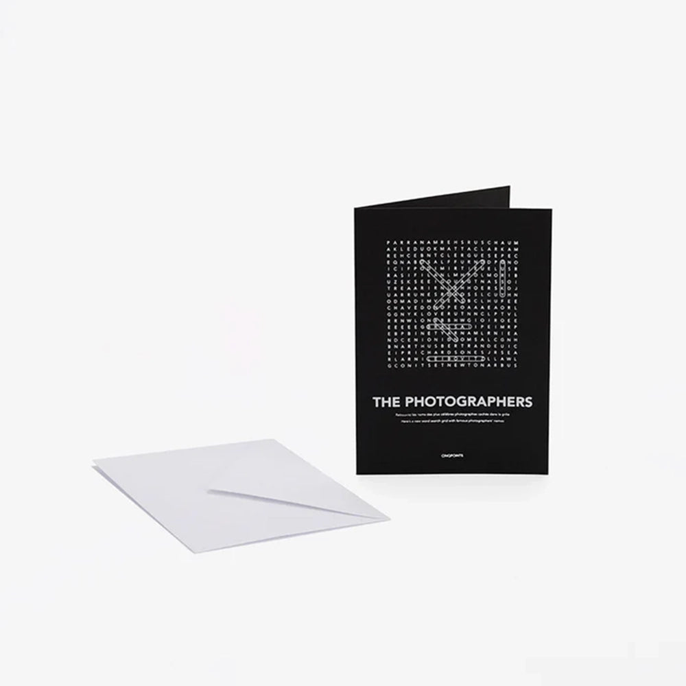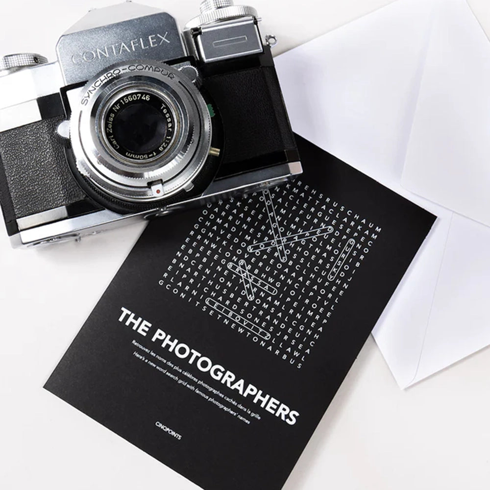 Find me I am a photographer is a postcard in which the names of the most famous photographers in the world are hidden.