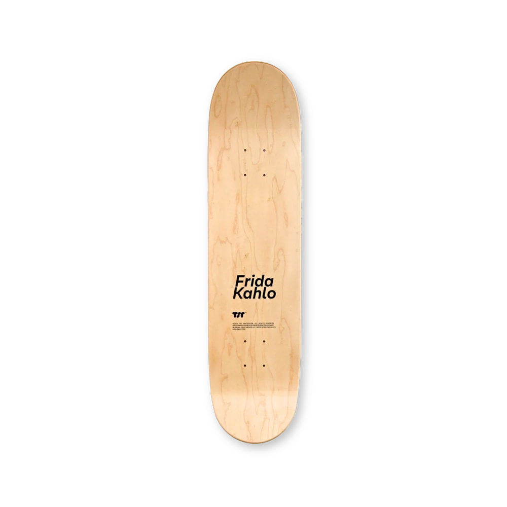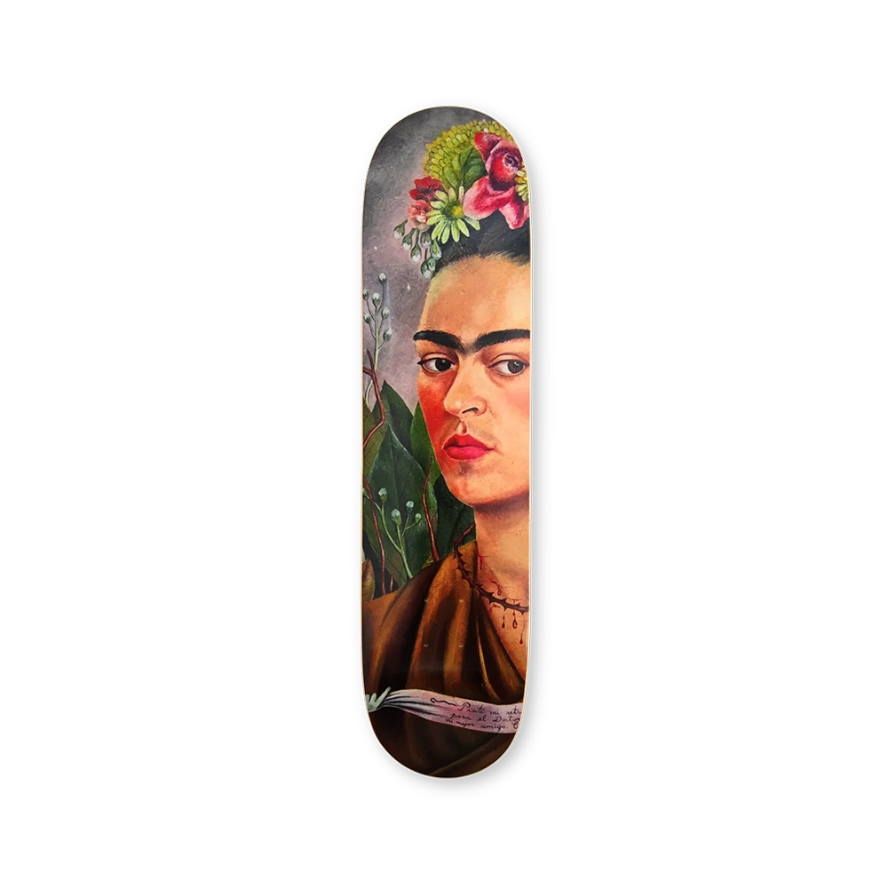 Self-Portrait Dedicated to Dr. Eloesser offers an intimate portrayal of Frida Kahlo’s resilience, sensitivity, and distinctive surrealist style. This edition presents the artwork on a high-quality skate deck, providing collectors with an elegant and immersive means to connect with Frida’s creative legacy.