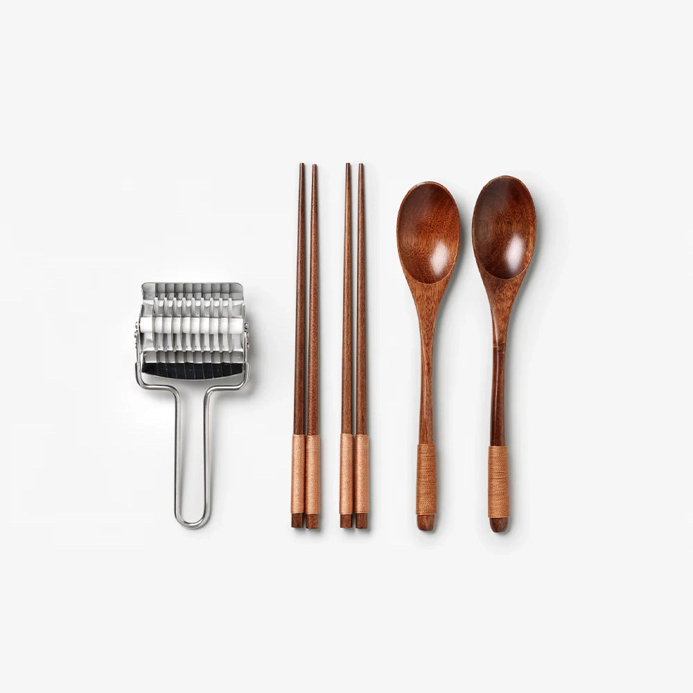 Included in this set: • Noodle Cutter – For slicing homemade noodles with ease. • 2 Ramen Spoons – Deep, wide spoons ideal for broth and toppings. • 2 Sets of Chopsticks – Perfect for sharing your ramen experience.