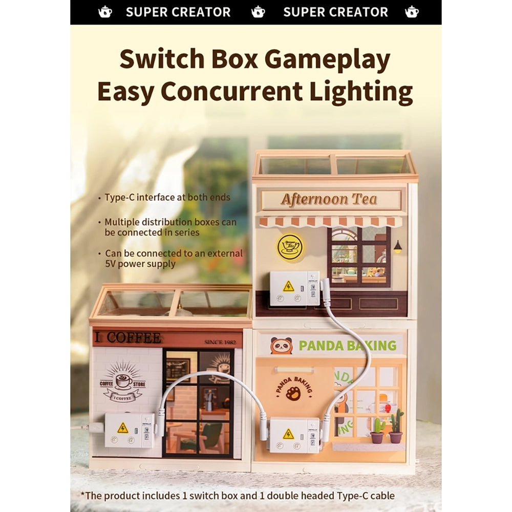 Sweet Sips Tea is a plastic DIY miniature house from Rolife’s Super Creator - Super Store Series. Constructed with three main structural boards featuring edge connectors, it allows for horizontal ("—"), vertical ("I"), and varied ("L," "Pin") stacking methods. This design ensures a sturdy final build and offers seamless compatibility with other Super Creator kits for expanded creativity.