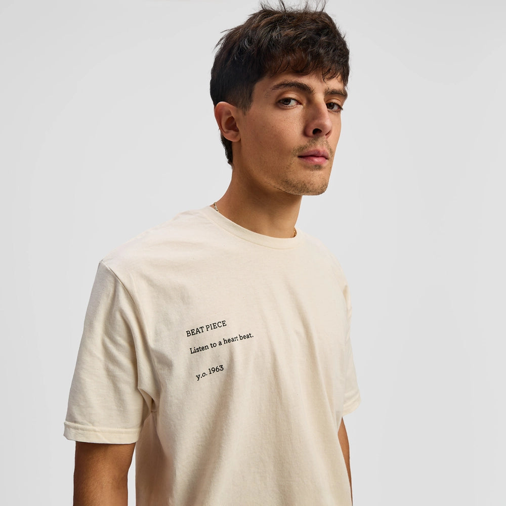 Exclusive to the MCA, this 100% cotton t-shirt displays the text, “Beat Piece: Listen to a heart beat”. On the upper right-hand corner of the shirt.