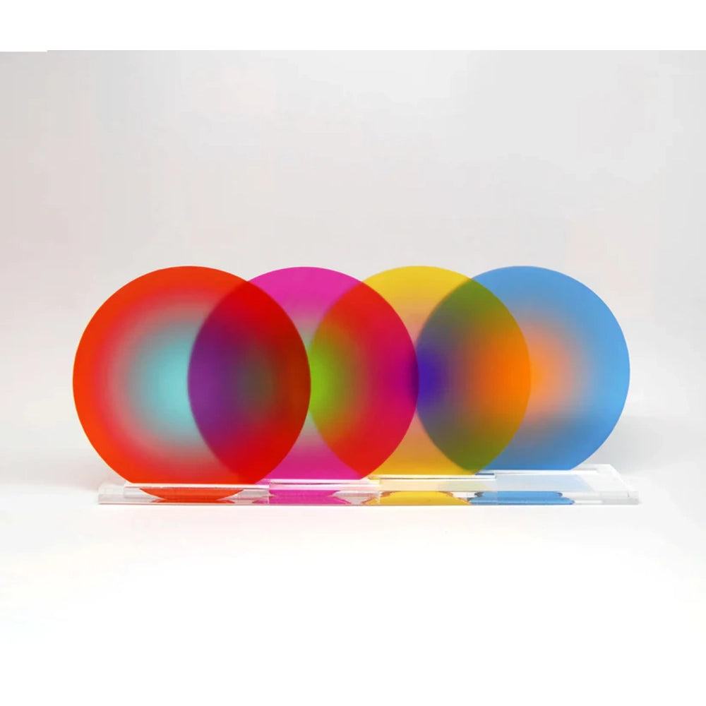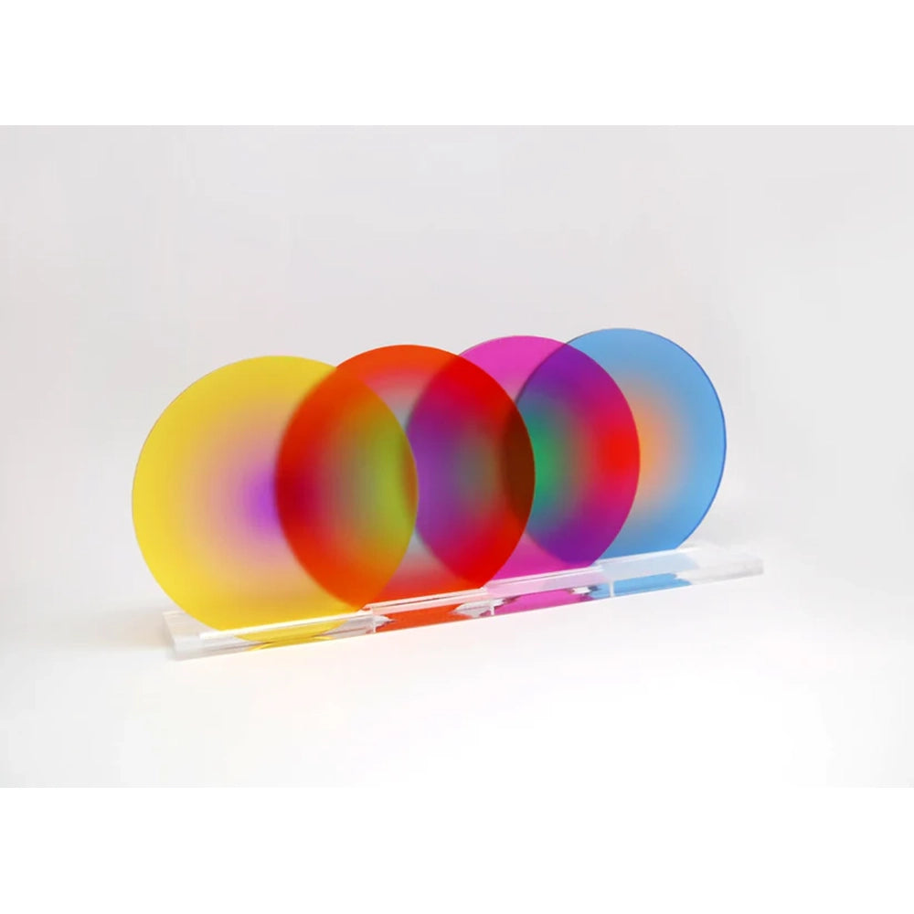 The Gradient Coasters are a set of four acrylic coasters designed by Portugal-based graphic artist Yoni Alter, complete with a clear display stand. Each coaster measures approximately 4″ (9 cm) in diameter and features a gradual color shift—creating a sculptural, playful setup whether stacked or displayed.
