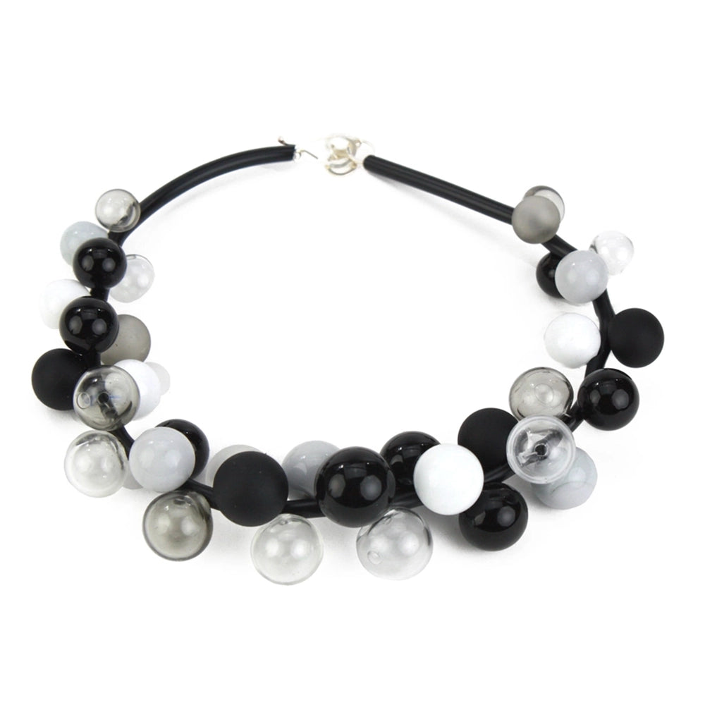 Elevate your style with this handcrafted glass necklace! Blown glass beads bubble effervescently on a soft rubber cord. Vibrant shades of blues and greens make this a delightful fresh mix of colors.
