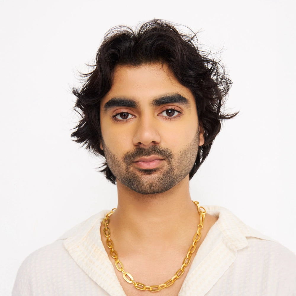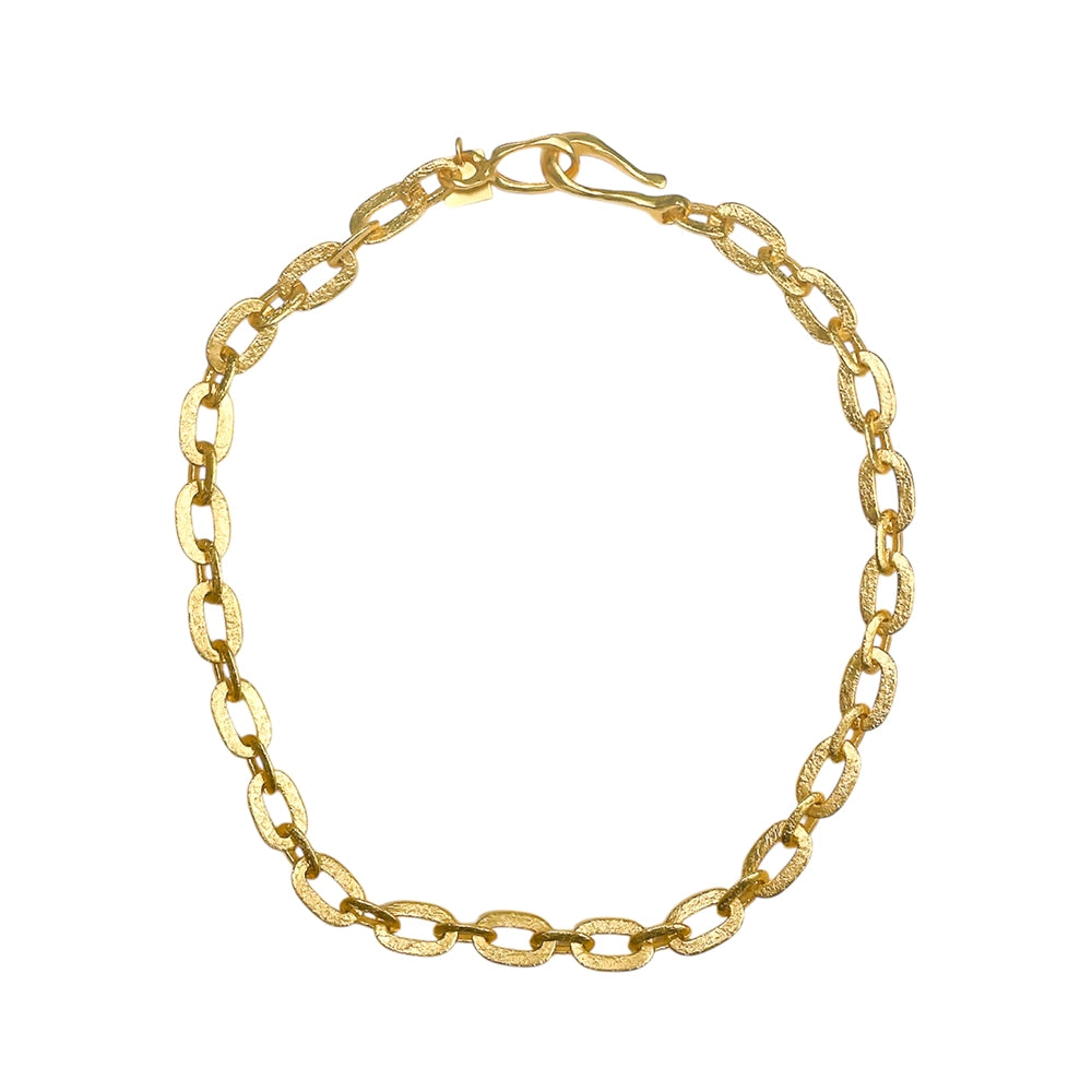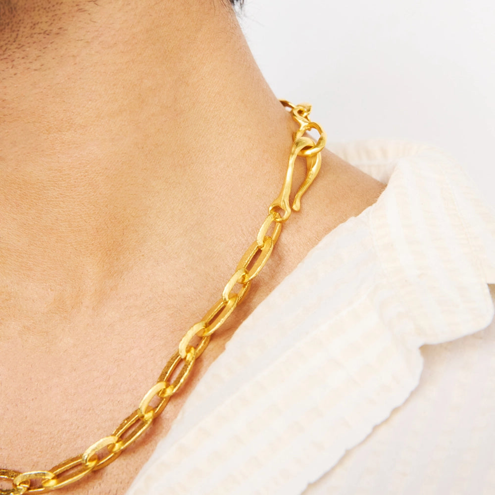 At 21" total, the necklace is made up of steel machine made chains that are then hand painted and set into acid. The result is a beautiful texture that really stands out with the gold plating. With the handmade hook closure in the front, or bring the loop through the hook and wear it as a small Y neck.