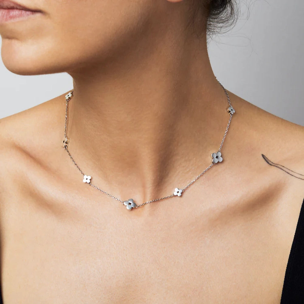 Made from sterling silver, this necklace displays flowers scattered around the chain. Simple and minimalist, this necklace can be styled with any outfit.